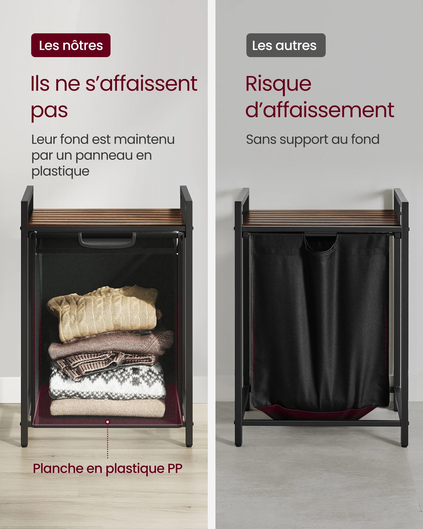 Associé fonctionnalité et style. Le sac amovible permet de collecter le linge facilement, tandis que le plateau supérieur en bois rustique offre un espace supplémentaire pour poser des accessoires.