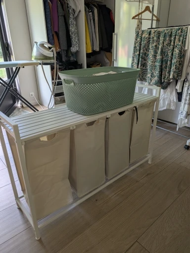 Avec quatre compartiments, ce modèle facilite le tri du linge dès le départ. Les sacs amovibles rendent la gestion plus simple, chacun pouvant être transporté séparément.